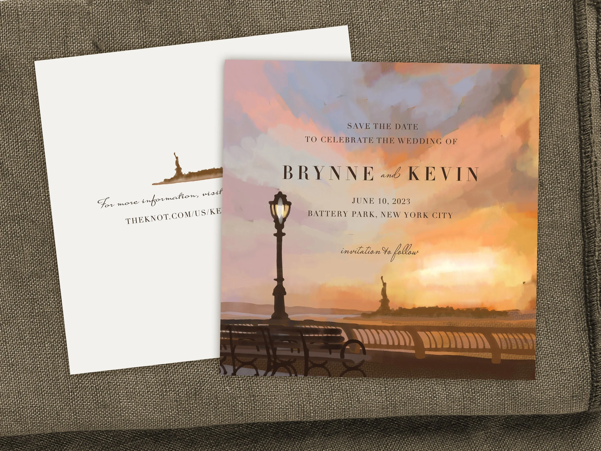 Battery Park at sunset—the couple’s venue locale!—inspired the full-colour, watercolour painted backdrop of this gorgeous Save Our Date card. We went with a striking square format and kept it simple with just the URL information on the reverse.