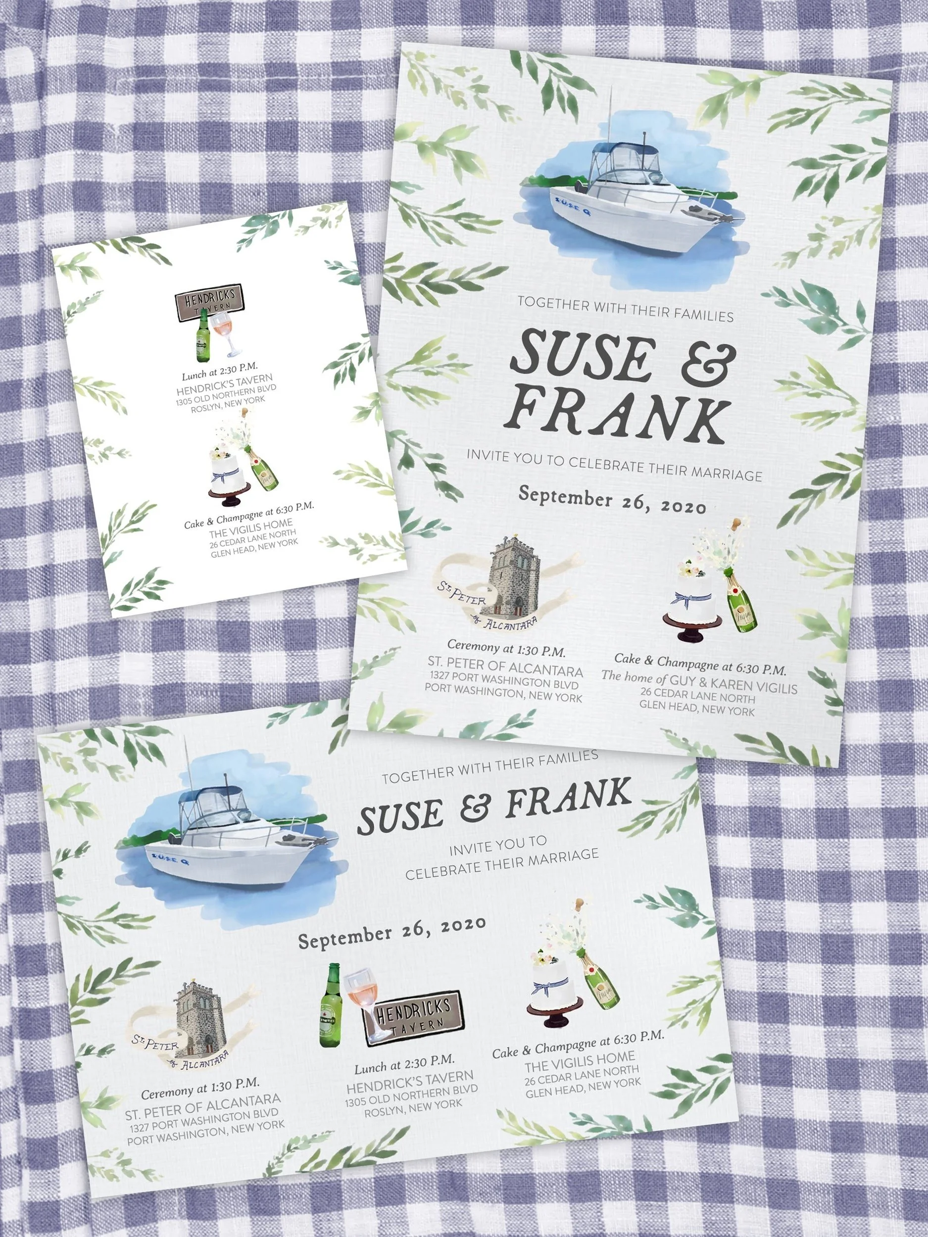 Once the event needed to be redesigned, made more intimate, and change venues, we redesigned the invitation to suit evite options as well. We went through a few iterations before landing on the appropriate format. The final design features a portrait of the couple’s beloved boat!