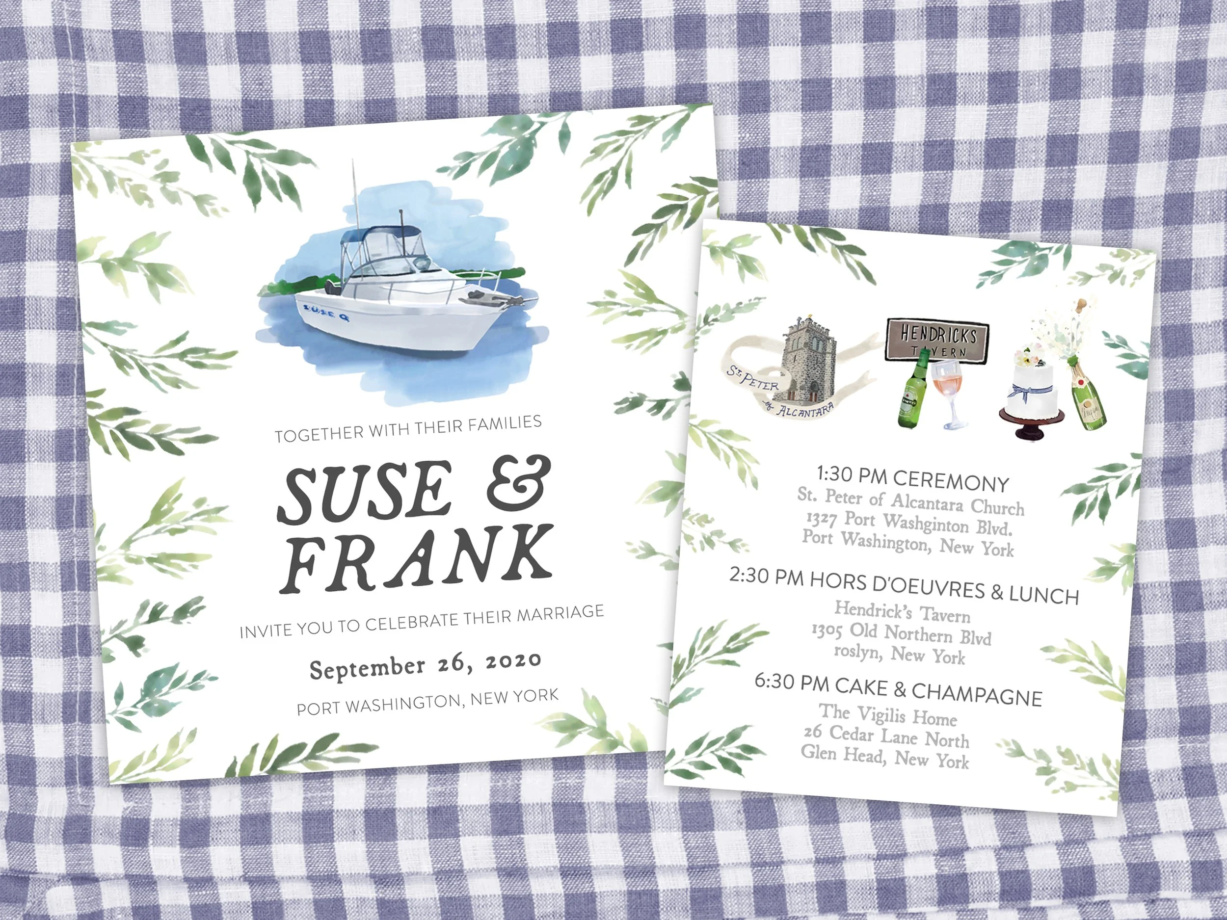 This couple had a curveball thrown at them in 2020 in the midst of planning their wedding event. The pandemic made for an unusual (& interesting!) invitation design process. Originally, I had pitched a gate-fold printed invitation with wildflowers on the outside and an illustration of Manhasset Bay with all the event information on the inside. The couple wanted to forgo the florals and highlight their seaside locale, and I loved the distinctive look of the seagull themed crest option.